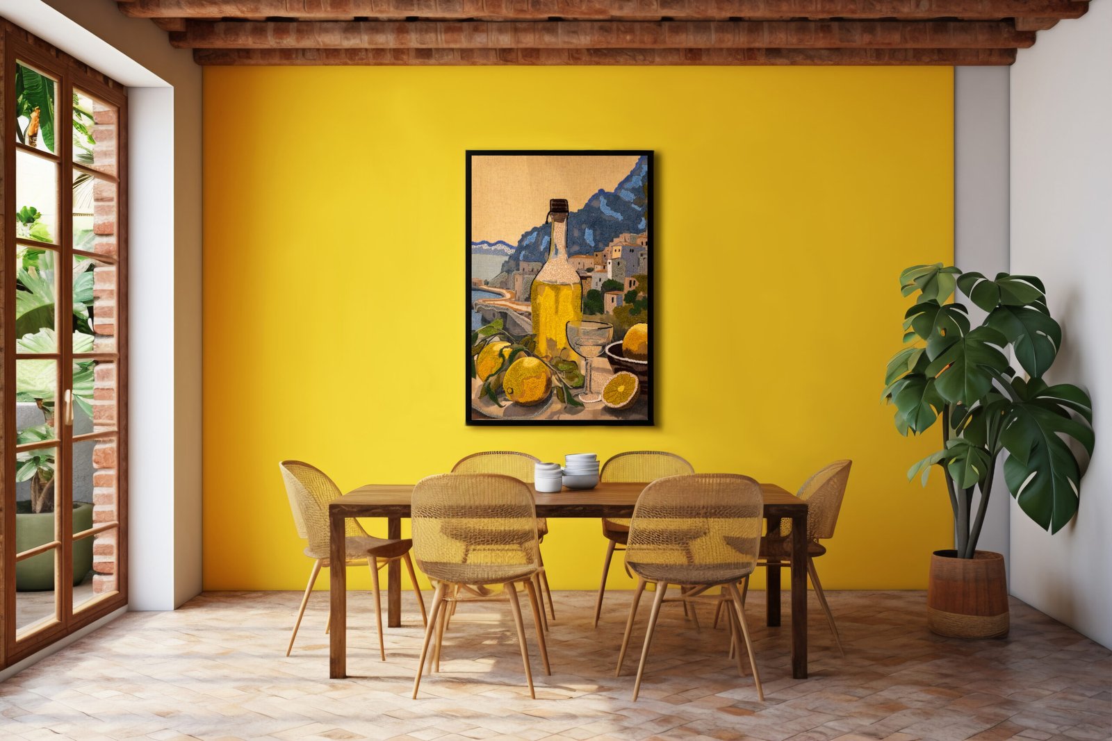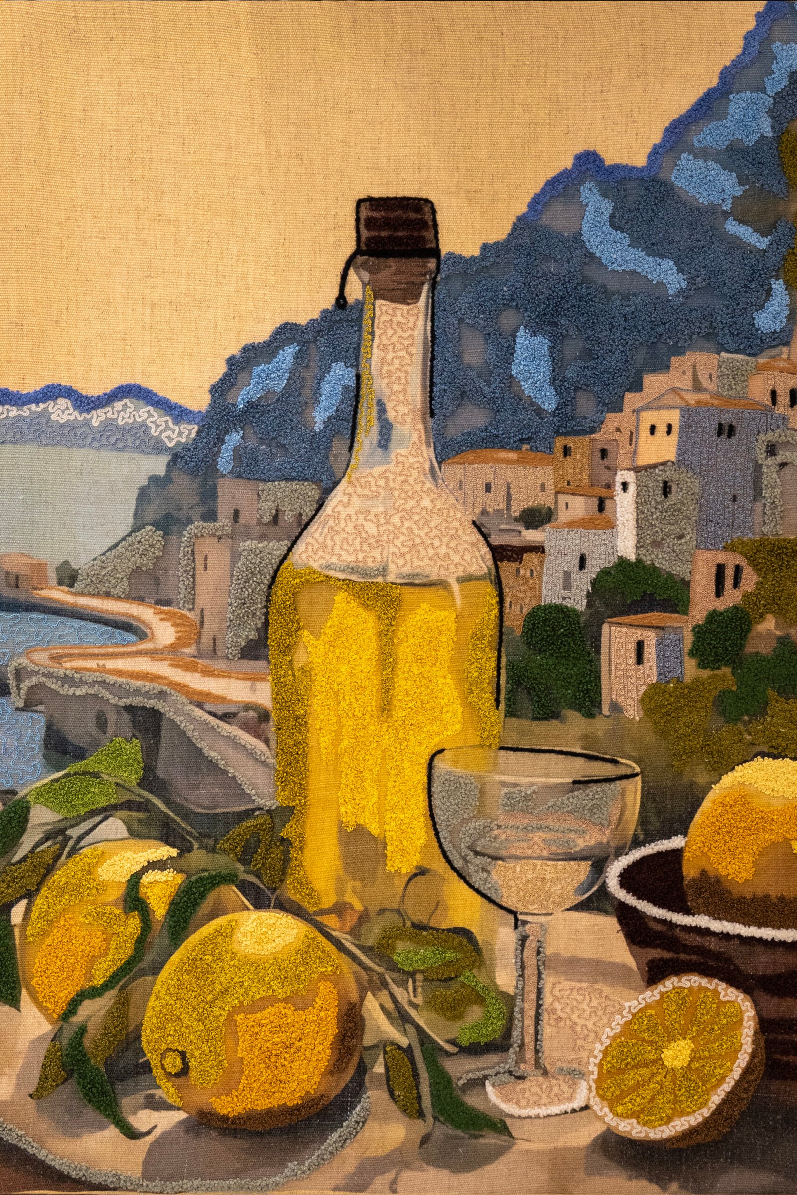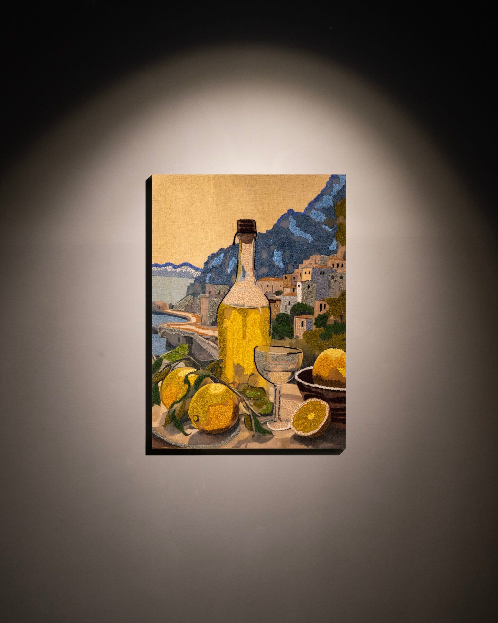 | Bring the warmth of the Mediterranean into your home with this exquisite embroidered wall art. Featuring a rustic still life of fresh citrus fruits, a bottle of golden liqueur, and a glass set against a sunlit coastal village and dramatic mountain backdrop, this piece radiates charm, tradition, and timeless beauty. Hand-embroidered details enhancing the textures and the vibrant yellows and greens of the fruit, creating a harmonious composition. Perfect for kitchens, dining rooms, or spaces that celebrate slow living and artisanal design, this artwork captures the essence of sun-soaked coastal life and the simple joys of food, drink, and community.