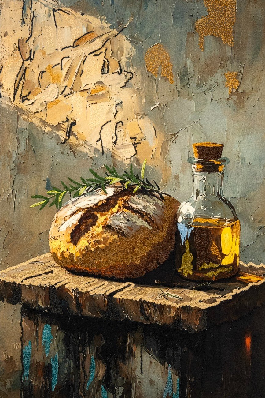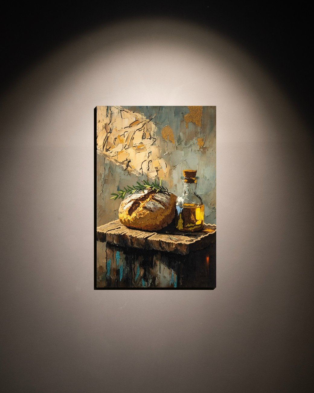 Add warmth and texture to your space with this beautifully crafted embroidered wall art. Featuring a freshly baked loaf of bread and a glass bottle of golden olive oil, this piece captures a cozy, farmhouse-inspired aesthetic. The artwork blends rich, hand-stitched embroidery with detailed brushwork, highlighting the bread’s crust, the reflective oil, and the natural wooden surface.