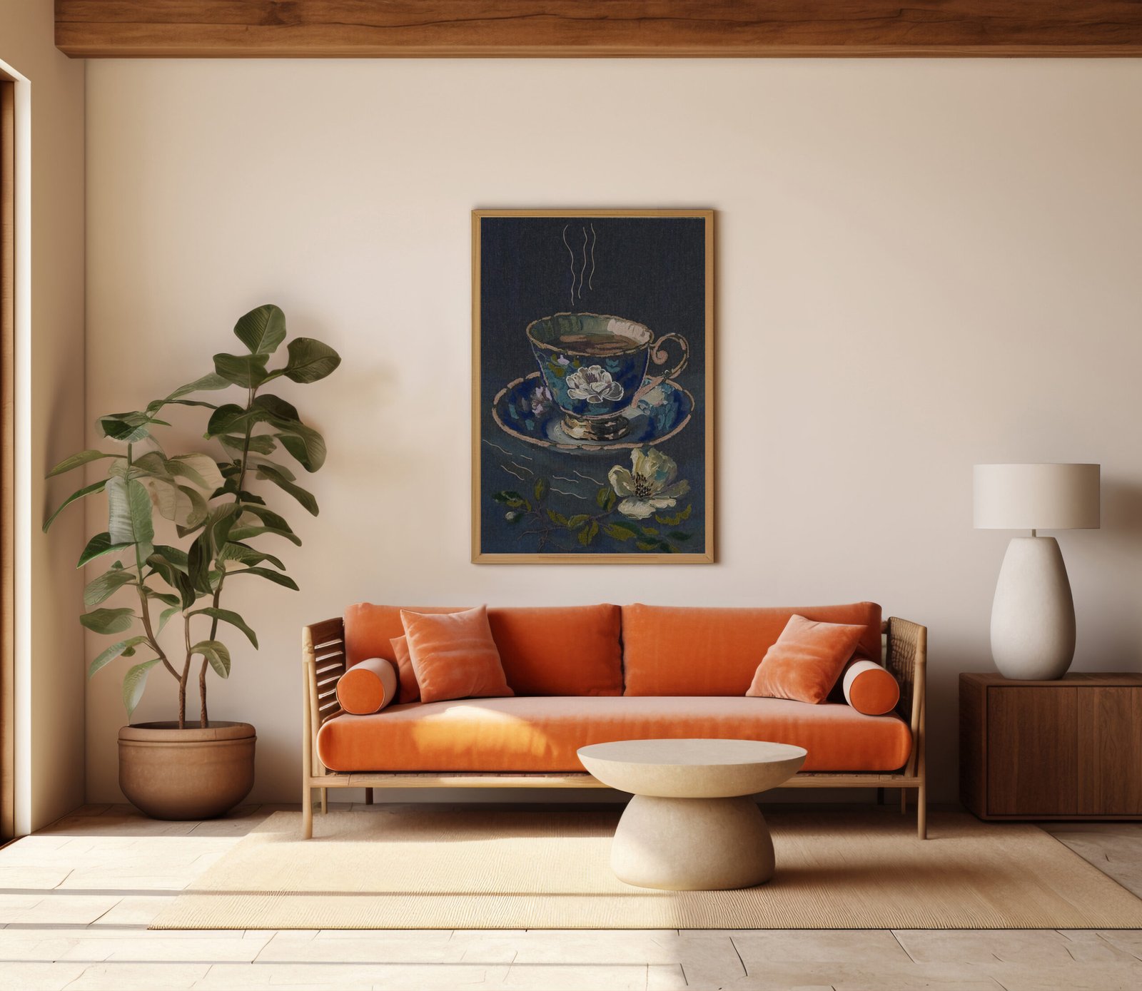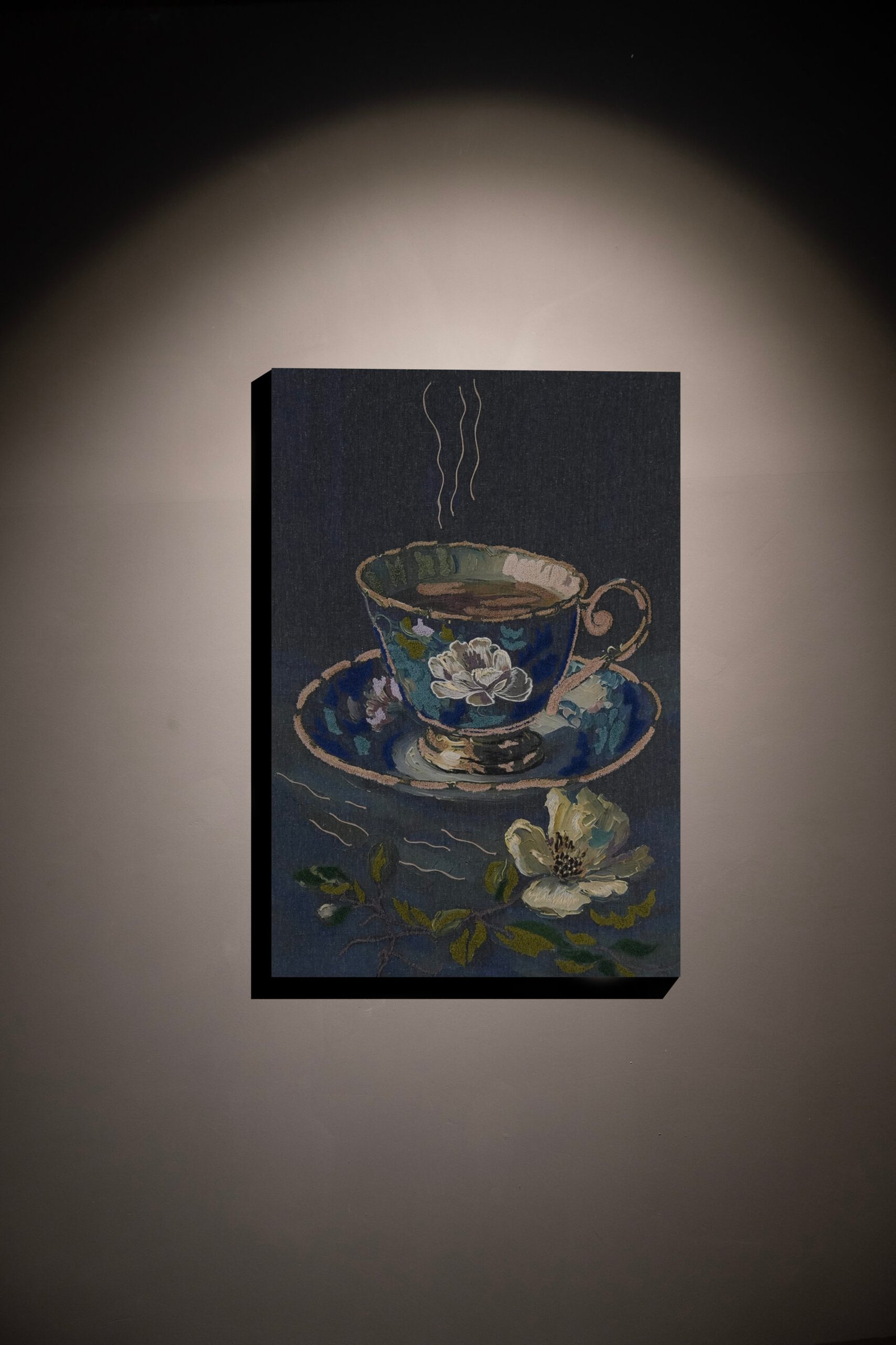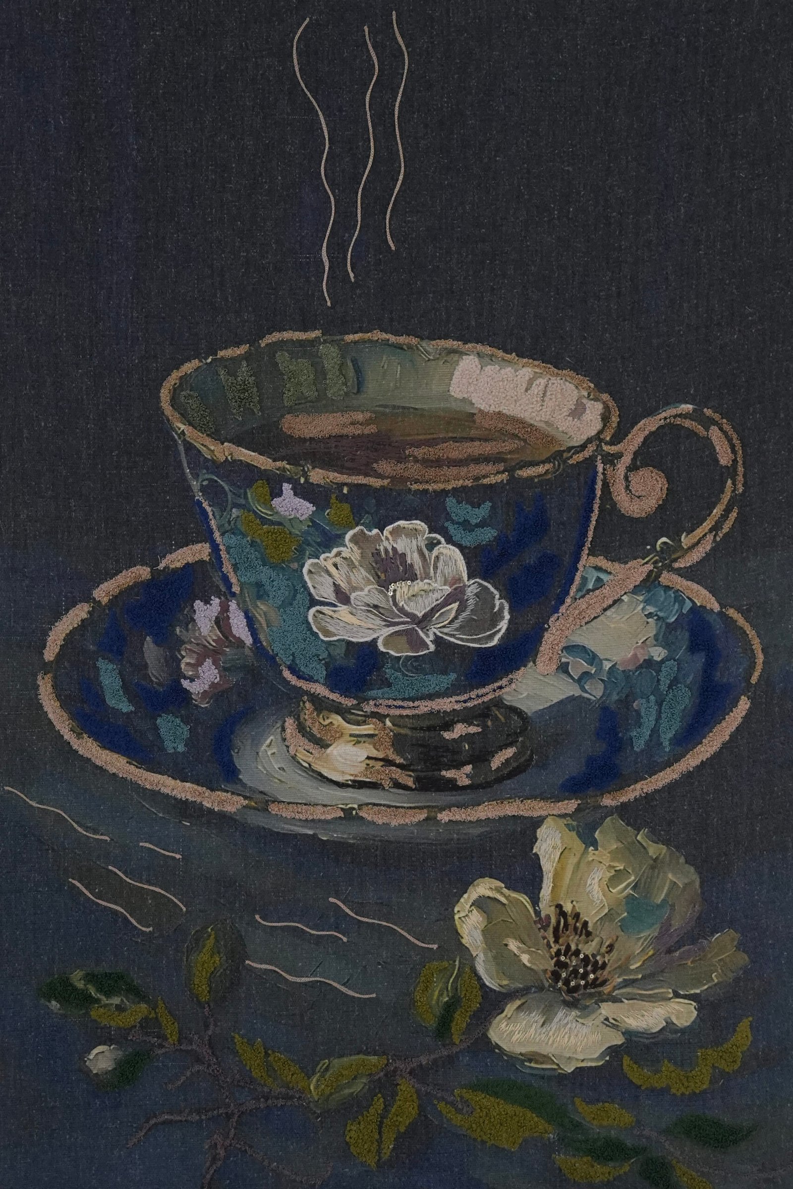 The Ornate cup – Handcrafted with precision, this artwork captures the soothing warmth of a quiet tea moment. The embroidery adds a tactile dimension to the painted details, giving the piece both visual and textural depth. Its timeless charm makes it a perfect fit for cozy kitchens, tea corners, reading nooks, or elegant dining spaces. Add a touch of calm sophistication to your home with this beautifully detailed embroidered wall art featuring a steaming teacup and saucer adorned with delicate floral motifs.